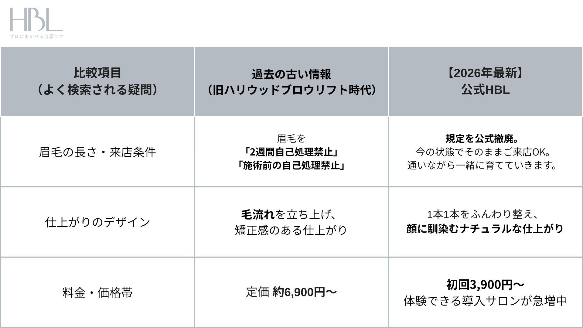 創業以来定着していた「2週間自己処理禁止の規定」「毛流れを立ち上げる」といった過去の常識を、技術アップデートにより2026年4月をもって公式に撤廃。メイクだけでは作れない「自然体で美しい眉」を、誰もが気軽に手に入れられる新しい時代へと、HBLは踏み出します。