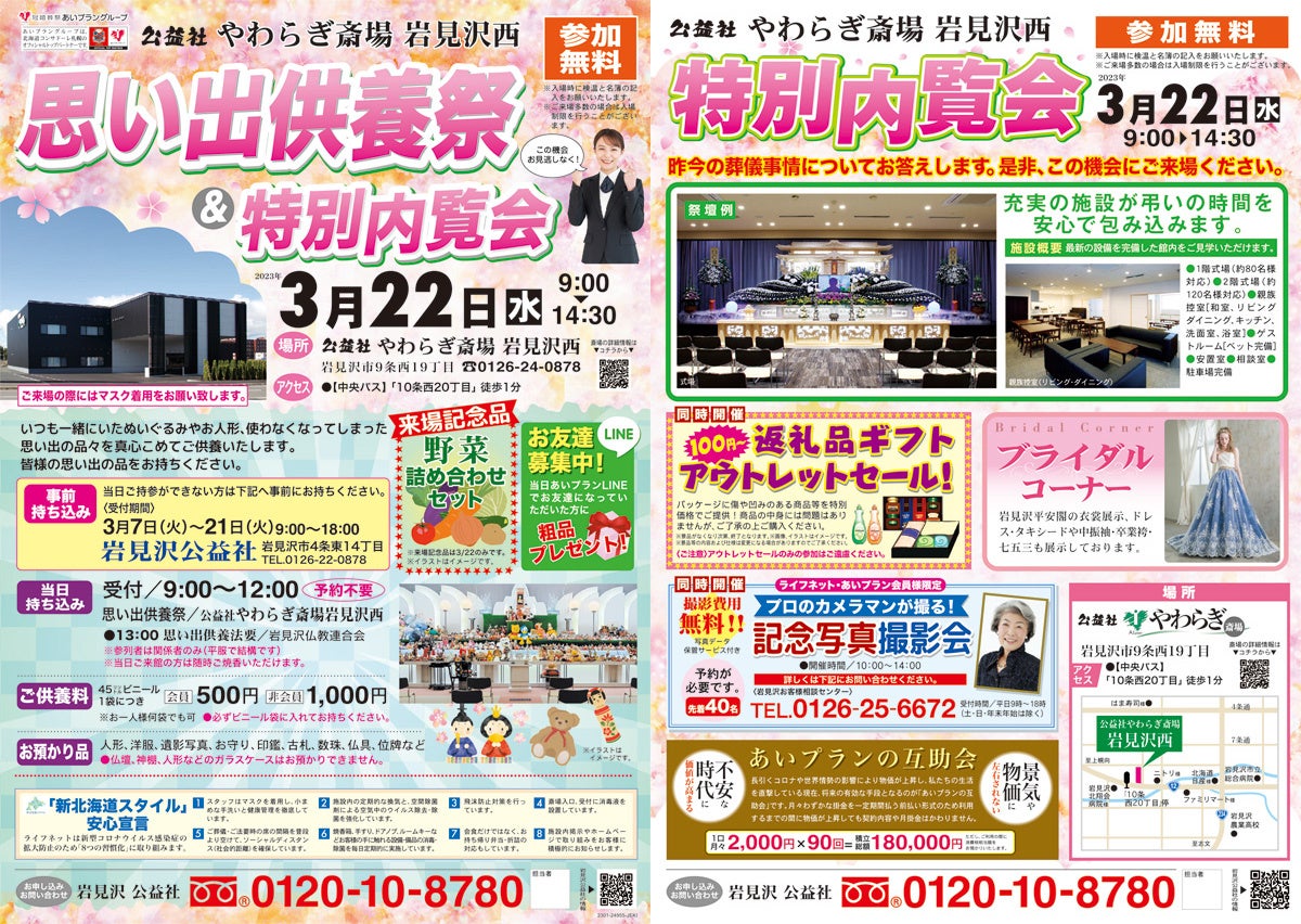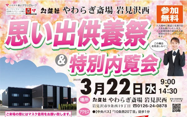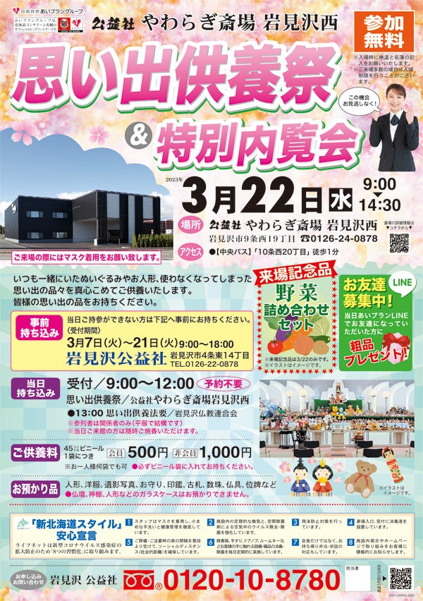 株式会社あいプラングループ(北海道札幌市/代表取締役・新道喜信)の公益社やわらぎ斎場岩見沢西(北海道岩見沢市9条西19丁目)にて、「思い出供養祭&特別内覧会」を3月22日(水)に開催します。思い出の品々を真心こめてご供養します。また、来場記念品として野菜詰め合わせセットをプレゼント。3月7日(火)~21日(祝火)まで岩見沢公益社にて事前持込も承ります。