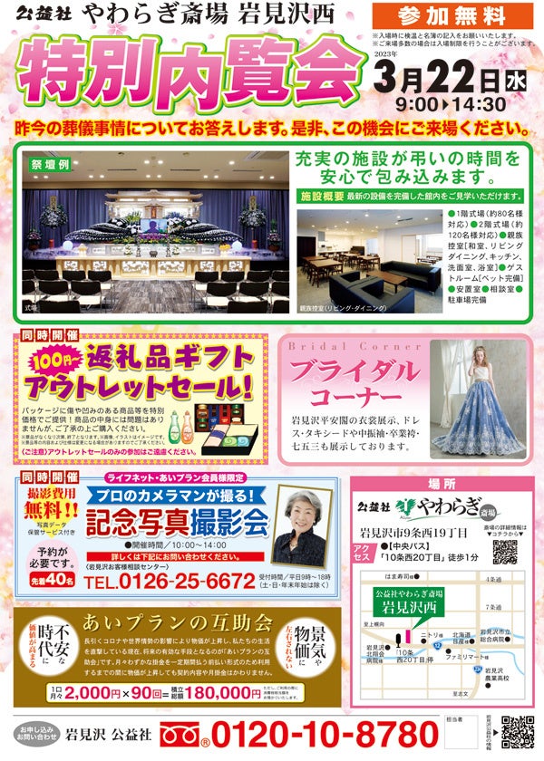 また、3/22当日にご来場いただいた方には野菜詰め合わせセットを来場記念品としてプレゼント。その他、返礼品ギフトアウトレットセールやお葬式・法要相談、ブライダルコーナー、公益社やわらぎ斎場岩見沢西の施設見学などの催しを行っております。