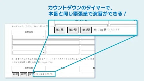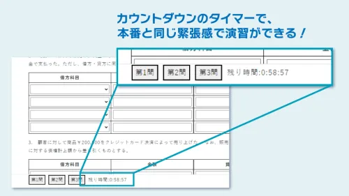 ネット(CBT)試験を完全再現したカウントダウン形式のタイマー機能もあり、制限時間のある本番と同じ緊張感で模擬試験の演習も行うことができます。
