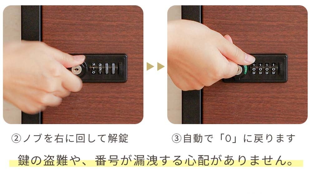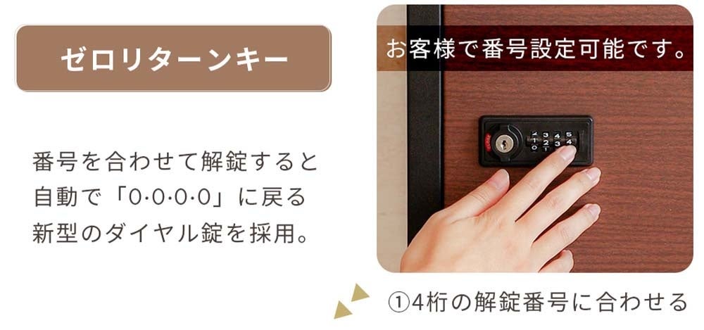 「ゼロリターン機能」とは、施錠時に4つの暗証番号(ダイヤル)を自動で「0」にリセットする機能です。これがあることで、ダイヤル番号の崩し忘れによる盗難や暗証番号の漏洩を防止します。