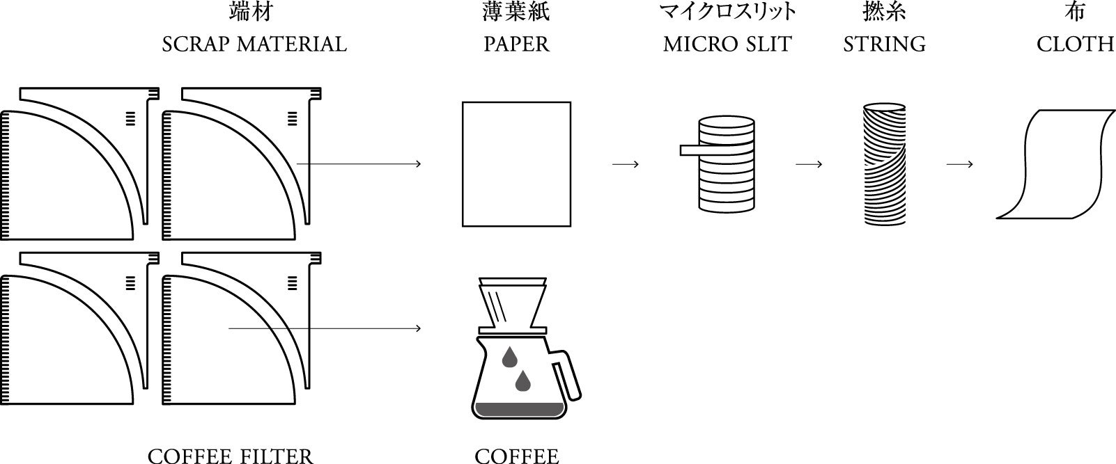 廃棄されていたコーヒーフィルターの端材が紙、糸、生地に生まれ変わりました。