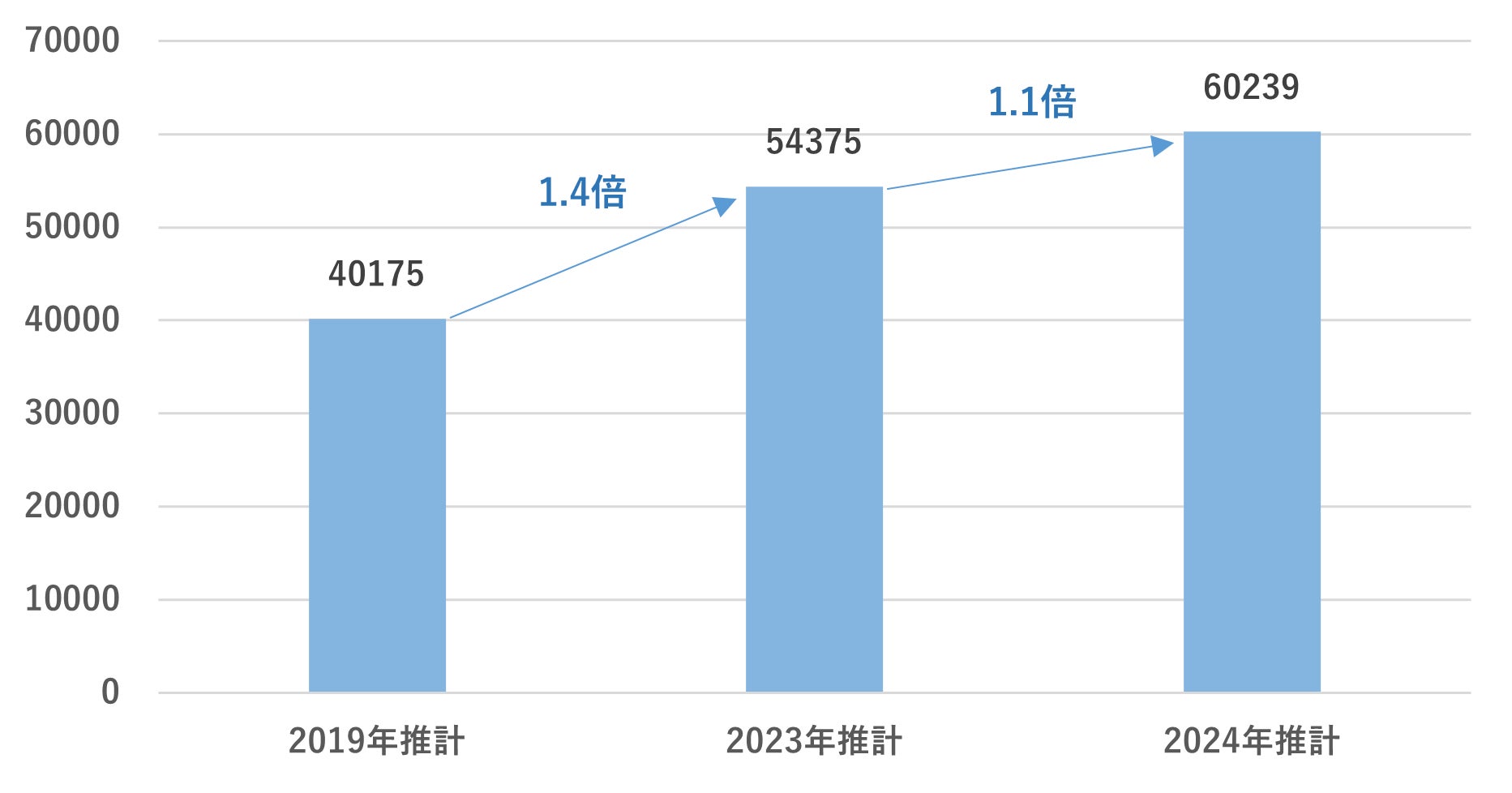 リカバリー市場は2019年から2024年にかけて着実な成長を続けており、5年間で約1.5倍の市場規模拡大が見込まれ、今後も成長が期待され、健康意識の高まりを背景に、市場は安定した成長トレンドを維持しています。