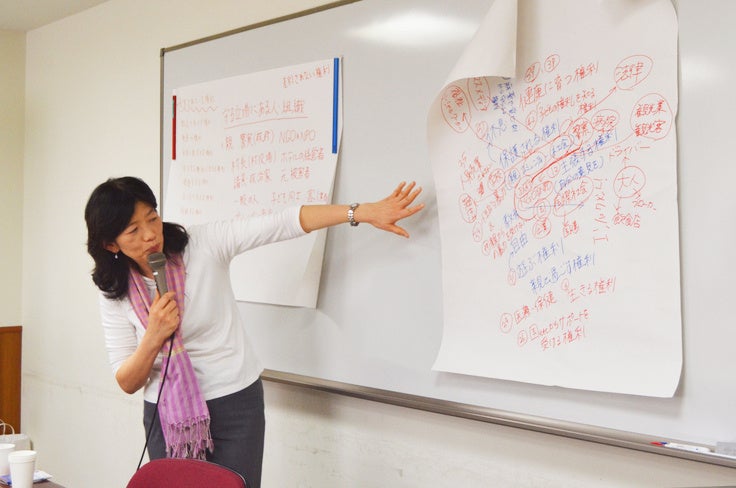 (写真:「かるたのワークショップを実施している文京学院大学の学生」)