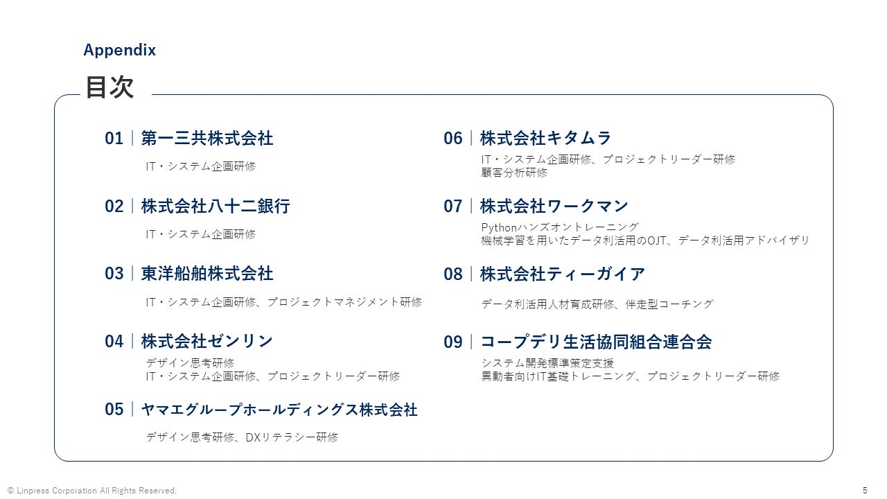 企業向けDX人材育成研修を提供する株式会社リンプレス(本社:東京都港区、代表取締役社長:三宮壮、以下、リンプレス)は、この度、最新のDX人材育成支援実績をまとめた『導入事例集』を無料公開しましたので、お知らせします。
