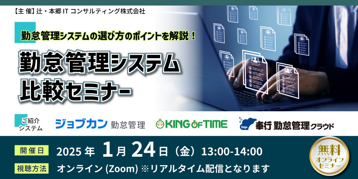 辻・本郷 ITコンサルティング株式会社(本社:東京都渋谷区、代表取締役社長:黒仁田 健)は、2025年1月24日(金)に無料セミナー「【25年1月版】大手各社が解説!勤怠管理システム比較セミナー」を開催します。本セミナーでは大手各社に勤怠システムの製品機能面を解説いただき、質問にも回答いただきます。