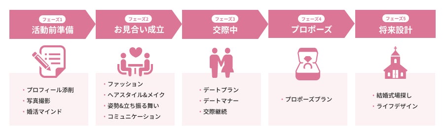 結婚相談所の活動は、大きく5つのフェーズに分かれ、 「活動前準備」、「お見合い」、「交際」、「プロポーズ」、「将来設計」とフェーズごとに会員様の悩みは様々です。 IBJでは、それぞれのフェーズによる悩みを解消し、幸せなご結婚に進んでいただく方を増やすべく、『IBJアカデミー』を開講しています。 7月27日(土)のセミナーは特にフェーズ2、3においてお役立ていただける内容となっております。