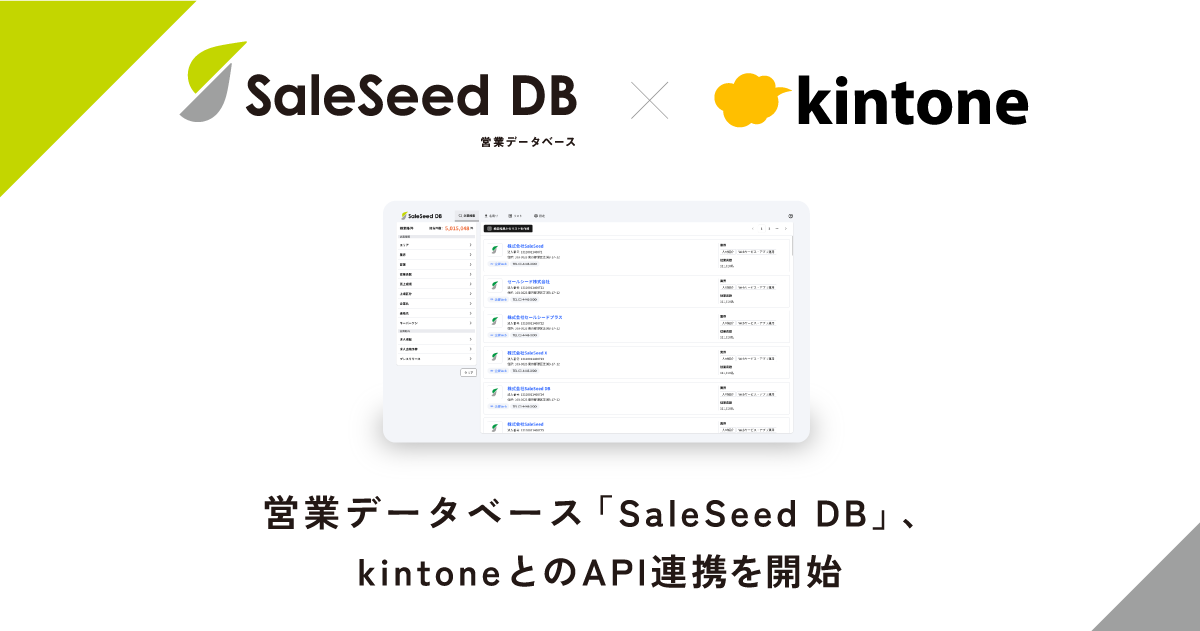 「夢ある人の実行力になる」をミッションに掲げる株式会社SaleSeed(本社:東京都港区、代表取締役:大矢 剛大)は、2026年2月4日より、営業データベース「SaleSeed DB」とサイボウズ株式会社が提供する「kintone(キントーン)」の連携機能を提供開始いたしました。 kintone上の顧客データにSaleSeed DBの情報を直接連携させることで、リスト作成から管理までの一元化を実現し、営業活動のDXを加速させます。