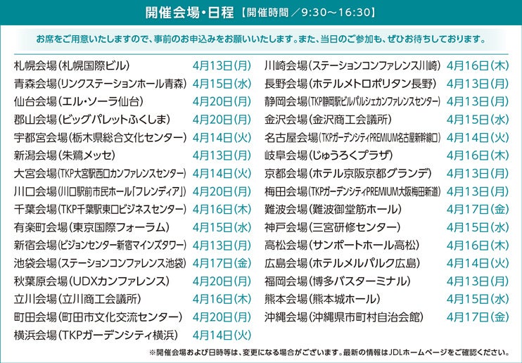 株式会社 日本デジタル研究所(略称:JDL、代表取締役社長:前澤和夫、本社:東京都江東区)は、会計事務所の皆さまを対象に、4月13日より全国31会場で、「JDL業務自動化・簡素化セミナー(参加無料)」を開催いたします。