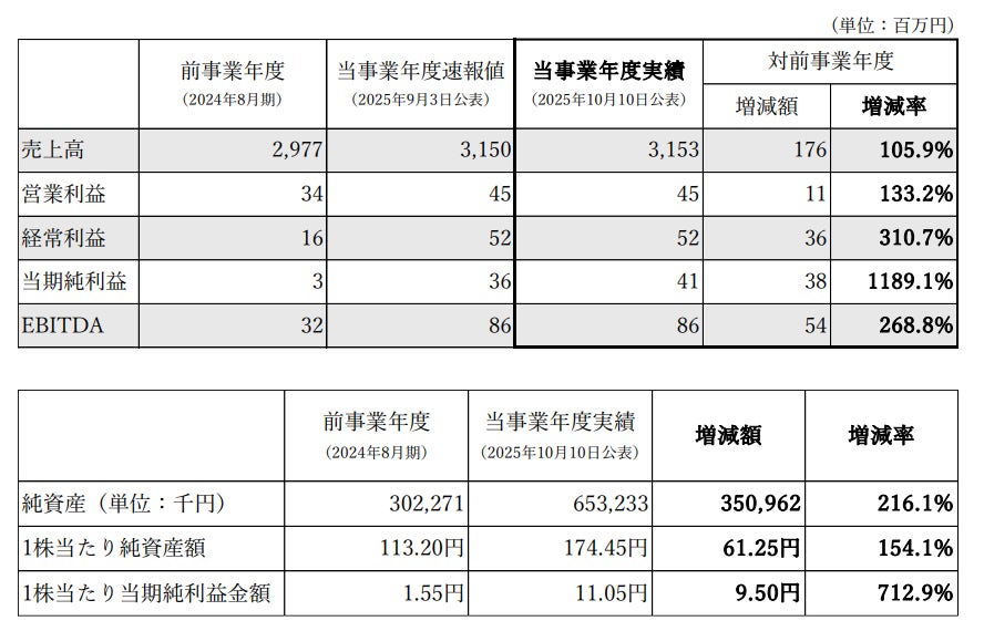 2025年8月期決算発表(2024年9月1日~2025年8月31日)