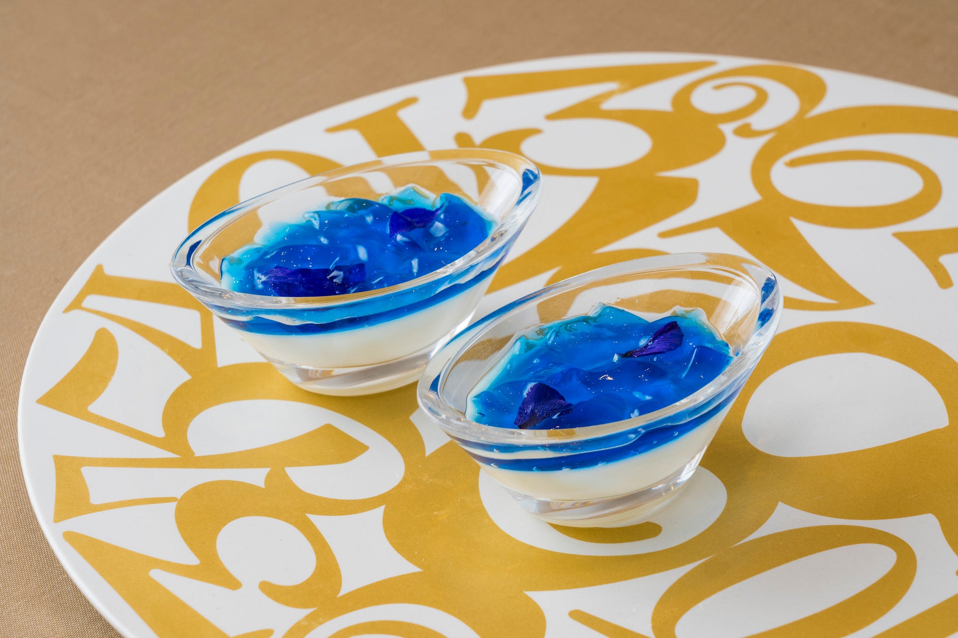 ヒルトン広島エグゼクティブペストリーシェフ鷲見 真奈美(すみ まなみ)は今回スイーツに「ロングアイランド」の象徴的なスクエアフォルムと新作「ロングアイランド デコ」の色彩美を取り入れました。「クロノ・ルージュ」は爽やかなアニスの香りを纏ったラズベリージャムをアクセントに効かせたストロベリーとラズベリーのムースで、ブルーベリーとブルーのチョコレートを飾り、洗練した印象を表現しました。「ゴールデン・アワー」は広島県産のレモン果汁を用いた爽やかな酸味のマスカルポーネチーズとはちみつの甘味がマッチした一品です。時計の針をイメージしたチョコレート細工を施した「ショコラ・タイム」は、チョコレートと相性が良いトンカ豆で香り付けしたミルクチョコレートムースです。レモングラスの香りを纏う生クリームを用いた滑らかな舌触りのパンナコッタ「ブルー・モーメント」には、バタフライピーの色鮮やかなジュレを施し、優美なブルーをイメージしました。