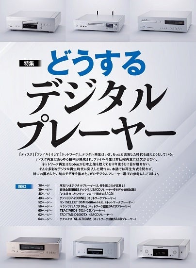 「ディスク」「ファイル」「ネットワーク」と、デジタル再生は今、さまざまなフォーマットや手段で音楽が楽しめます。そんな時代のデジタルプレーヤー選びの指針をお届け。国産のSACDプレーヤー6モデルを集めた比較試聴、さらにネットワークプレーヤー、SACDプレーヤー、CDプレーヤーの旬の6モデルを集めての徹底試聴&解説を展開して、読者の皆様の「どうする?」にお答えします。
