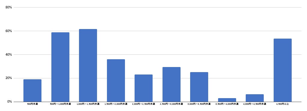全体として、「現金」、「ポイント」、「商品券」、「電子マネー」などよりお金に近い特典のほうが参加してみたいと思うことが分かりました。また、参加したくなる特典の相当金額について聞いてみると、4,500円以上相当と回答した「もらえるならいくらでももらいたい」と思われる層も一定数いるものの、ボリュームゾーンは500〜1,000円未満、1,000〜1,500円未満相当であることが分かりました。