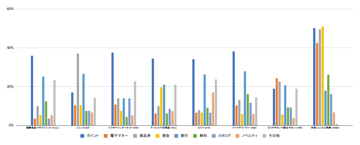 一方で、特典の相当金額のボリュームゾーンである500〜1,000円未満、1,000〜1,500円未満相当と回答した人の中では、「ポイント」や「電子マネー」が半数以上を占めました。少額であれば、日常の決済で使い勝手の良い電子マネーや貯めておくのに便利なポイントを選択する人が多いのかもしれません。