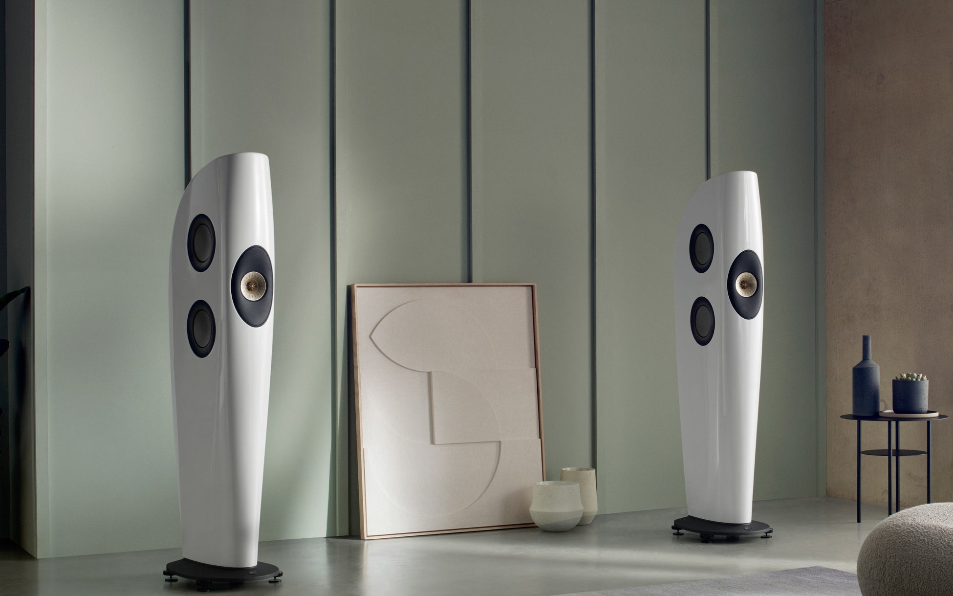 大胆で印象的なデザインが特徴のKEFのフラッグシップ機であるBladeは、低域、中域、高域が一点から放射される点音源の音響的理想を目指した独自の技術を搭載。