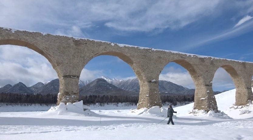 旧国鉄士幌線で使われた橋梁。糠平ダムの建設によりその役目を終えてダム湖の底に沈みました。今では渇水期にのみその姿をみることができます。老朽化が進みいつ崩壊してもおかしくない儚さが来る人を引きつけています。