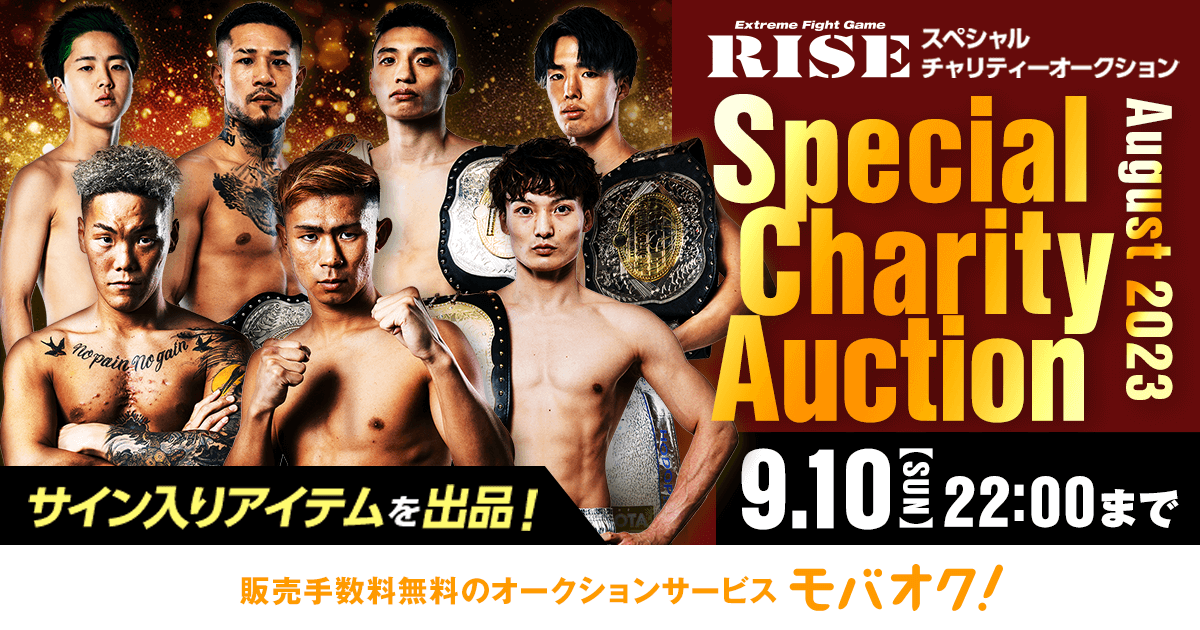 本オークションでは、格闘技イベント「RISE」の夏の一大イベントとして8月26日(土)に行われた「ABEMA presents RISE WORLD SERIES 2023 2nd Round」に出場した選手が実際に使用し、直筆サインを入れたアイテムなどが出品されます。