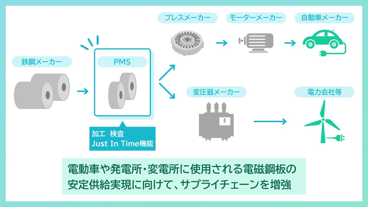 電磁鋼板は、ハイブリッド車やバッテリー式電気自動車など電動車のモーターコアや、発電所・変電所で使用される変圧器コアに使用されます。気候変動問題への対応が地球規模での取組課題となっている中、再生可能エネルギー発電所・グリッド新設に伴う変圧器および、電動車の需要増加が見込まれています。需要増に応える安定供給の実現のため、電磁鋼板サプライチェーンの増強が世界的に急務になっております。