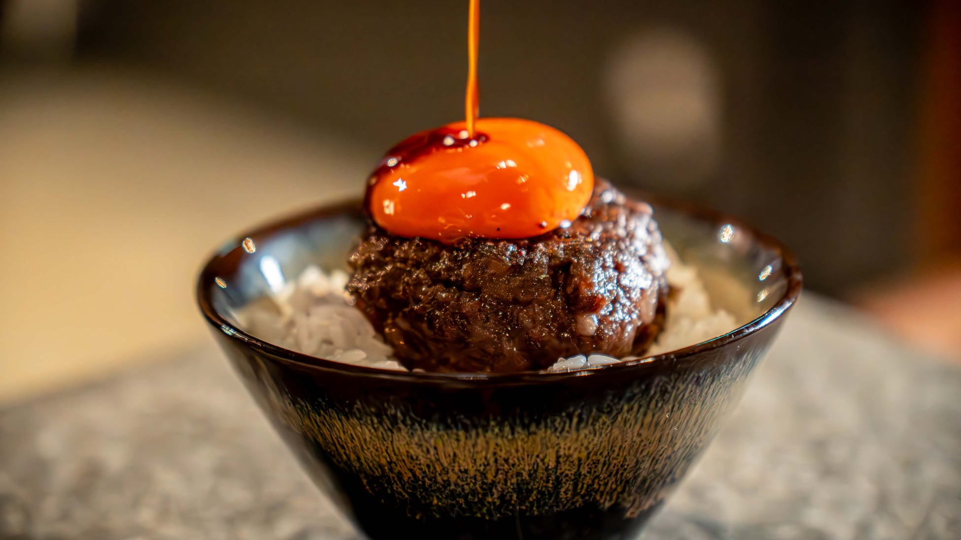 スペシャルメインには、普段なら出回らない⽥村⽜の様々な部位を詰め込んだ、贅沢なハンバーグをご用意いたしました。炊き立ての熱々の土鍋ご飯と濃厚な卵黄との相性は抜群!肉汁たっぷり、⽥村⽜の超粗挽きハンバーグがお箸で味わえる料理⻑渾⾝の逸品です。