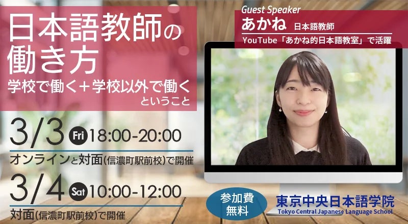 語学教育事業を展開するパスメイクグループの総合日本語教育機関、東京中央日本語学院(本校舎:東京都新宿区。以下TCJ)は、2023年3月3、4の両日に、特別講演会「日本語教師の働き方―学校で働く+学校以外で働くということ」を、東京都新宿区の同学院で開催します。YouTubeで30万人を越える登録者を持つチャンネル「あかね的日本語教室」で外国人向けに日本語学習コンテンツを公開している「あかね」氏が登壇します。YouTube活動も含め、日本語教師としてどのようにキャリアを積んできたか、これから日本語教師を目指す人に向けて語ります。参加無料。