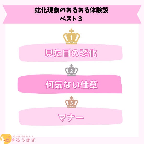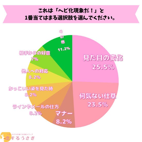 恋するうさぎ編集部が行った『蛇化現象のあるある体験談』のアンケートによると1位:見た目の変化が25.5%、2位:何気ない仕草が23.5%、同率で3位:マナーが8.2%、ラインやメールの仕方が8.2%、かっこいい姿を見た時が8.2%、他人への対応が8.2%という結果になりました。