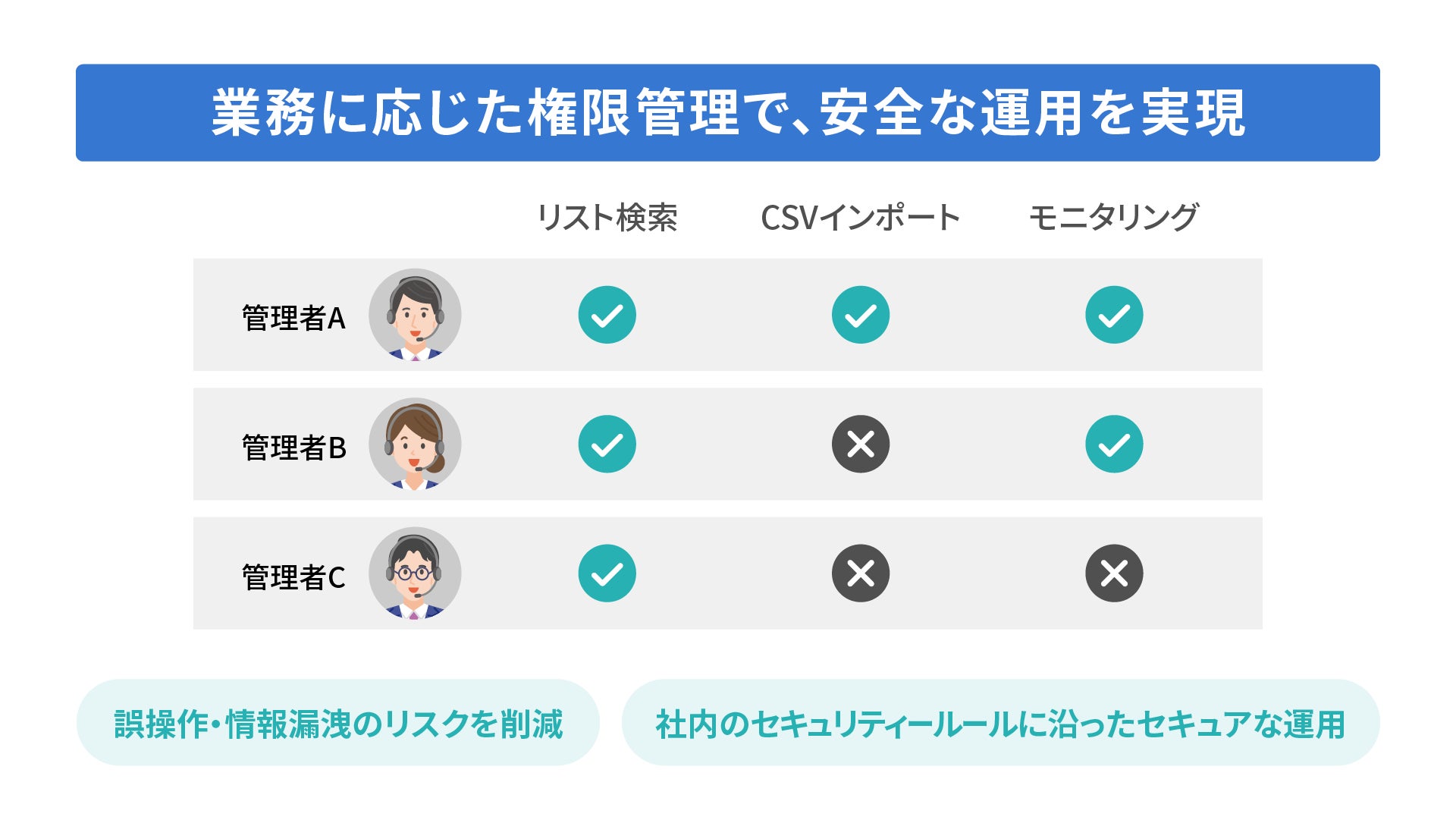 個別の業務範囲に応じた画面表示が可能となり、誤操作や不要な情報へのアクセスを防ぎ、安全な管理体制を実現します。