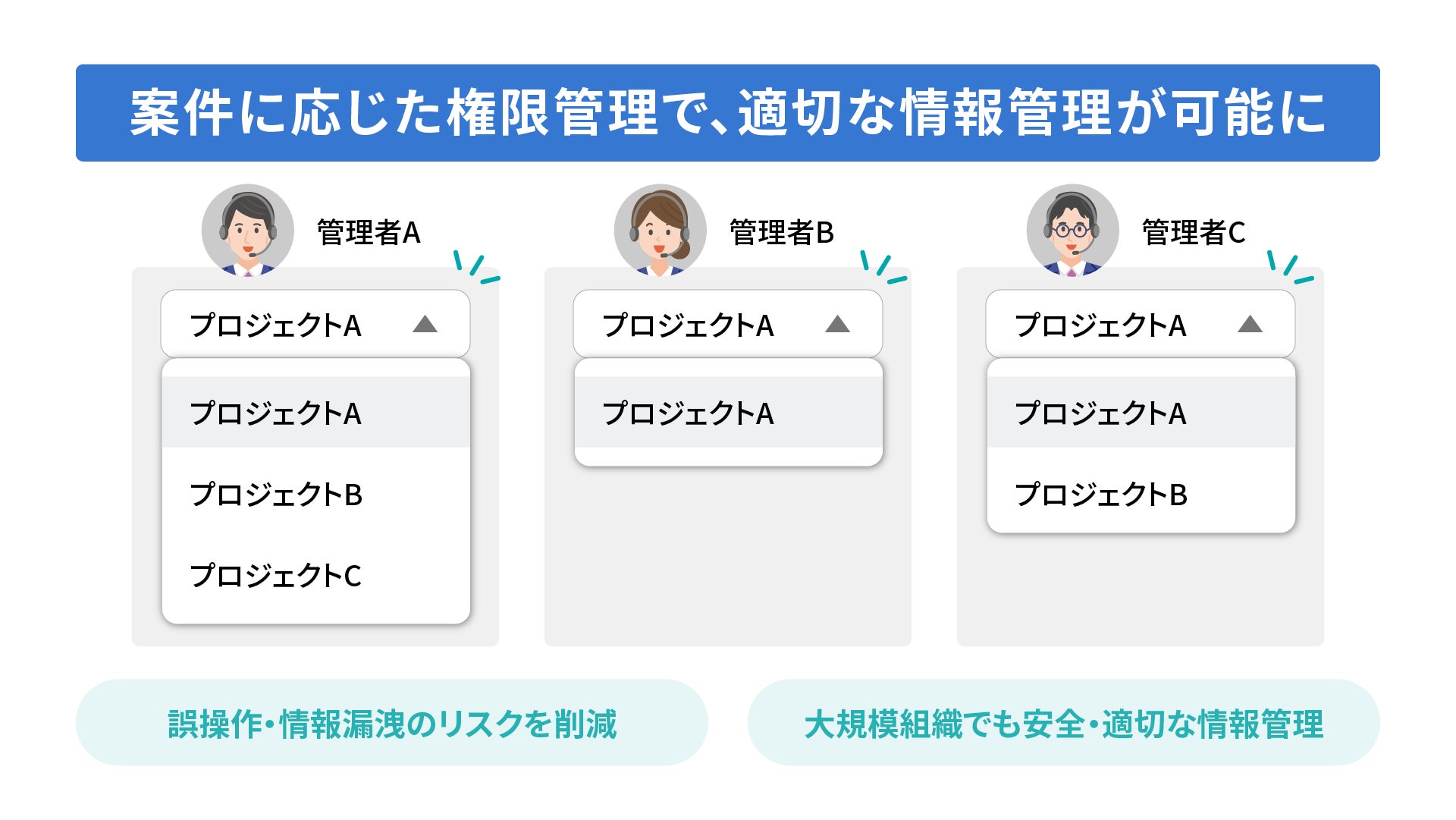 複数のプロジェクトを同時に運用する組織においても、管理者は自身に割り当てられたプロジェクトのみにアクセス・操作が可能となるため、意図しない変更や操作を防ぐとともに、情報漏洩リスクの低減にもつながります。さらに、プロジェクトごとの明確な権限設定により、不要な情報に惑わされることなく、担当範囲に集中できる環境を実現します。