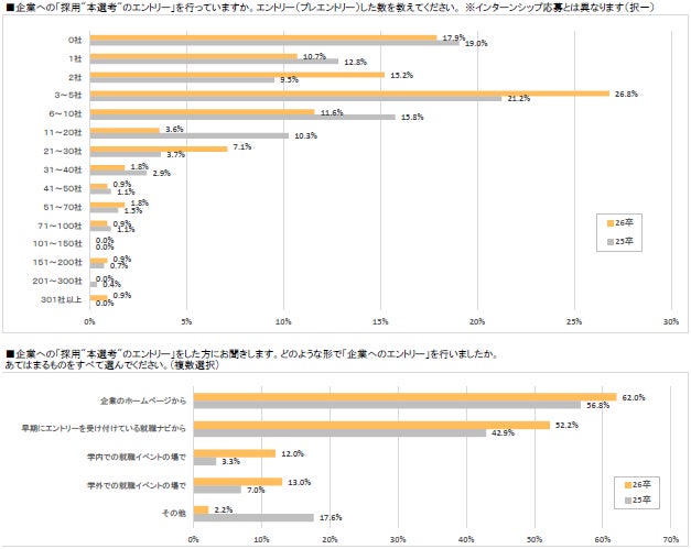 ・本選考エントリー数は3~5社が最多の26.8%。300社以上が0.9%いる一方で、0社は17.9%と2番目に多い結果となった。エントリーについては企業HPからが最多の62.0%。