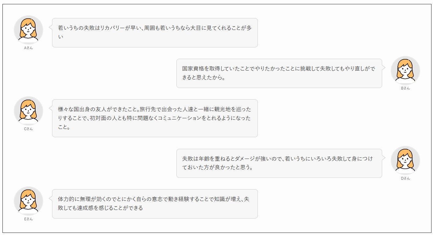 20代は失敗や恥をかいても周りが多めにみてくれてリカバリーが利きやすい時期だからこそ、積極的にチャレンジし色々な経験を積み視野を広げるべきだという声が多く見受けられました。