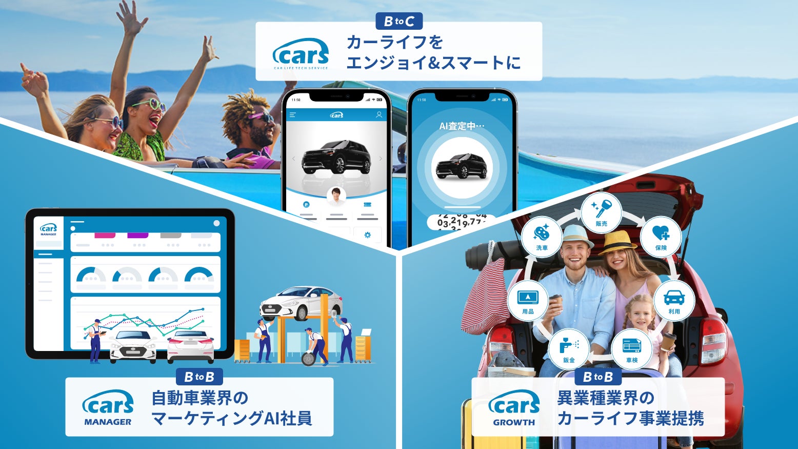 今後の対象サービスは、生活者のカーライフをエンジョイ&スマートに「cars (カーズサービス)」をはじめ、自動車業界のマーケティングAI社員「cars MANAGER(カーズマネージャー)」、異業種業界のカーライフ事業提携「cars GROWTH(カーズグロース)」、欲しいマイカーにスマート乗り換え「cars MARKET(カーズマーケット)」など全てのグローバルカーライフテックサービスを対象として取り組んでまいります。