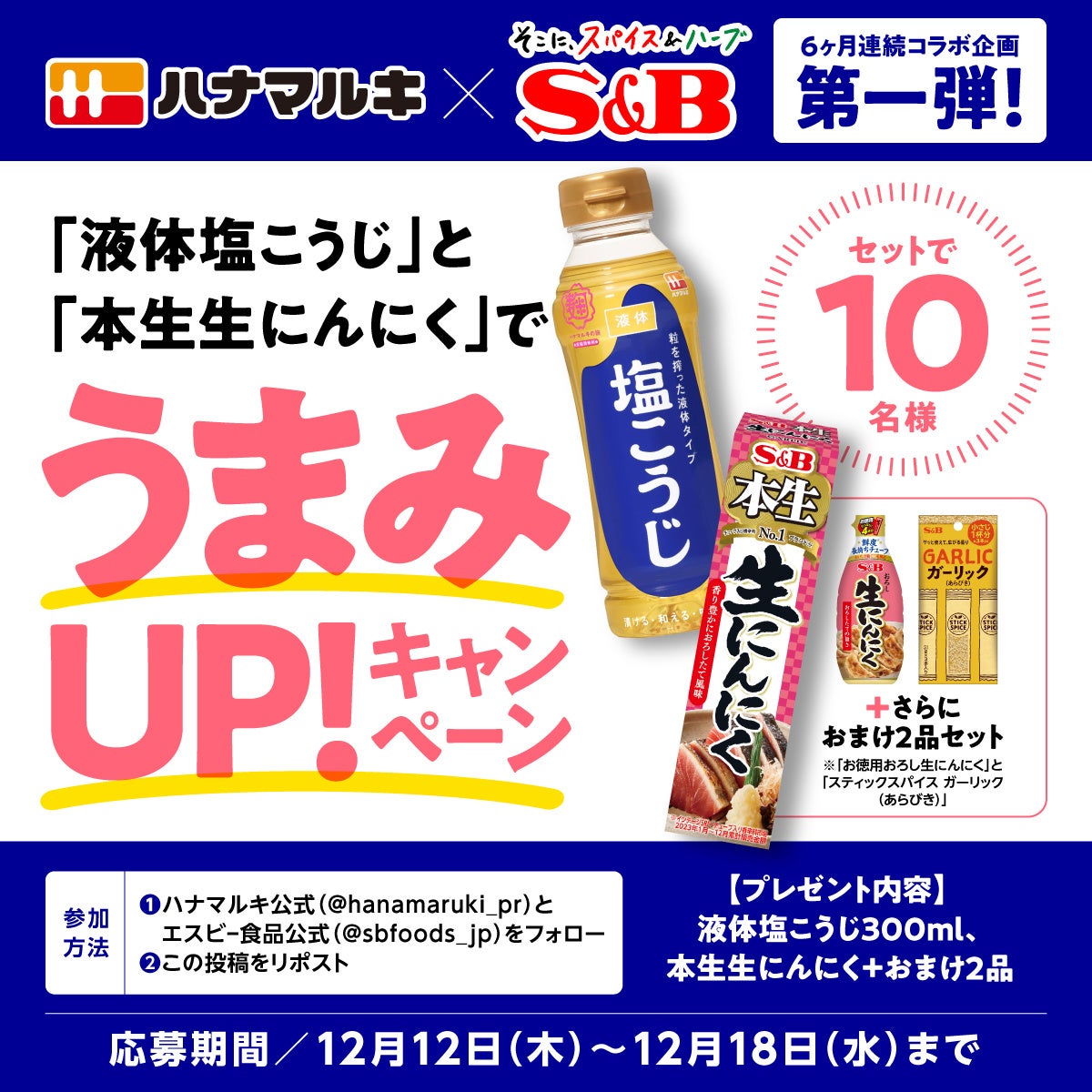 味噌・醸造製品メーカーのハナマルキ株式会社(本社 :長野県伊那市、代表取締役社長:花岡周一郎、以下当社)は、エスビー食品 株式会社(本社:東京都中央区、代表取締役社長 池村 和也、以下エスビー食品)の「本生生にんにく」と当社の「液体塩こうじ」のコラボレシピを、12月12日(木)より当社ホームページおよびレシピサイト「Nadia」にて公開します。また、当社公式 Xアカウントでは、 両商品が当たるプレゼントキャンペーンを実施します。