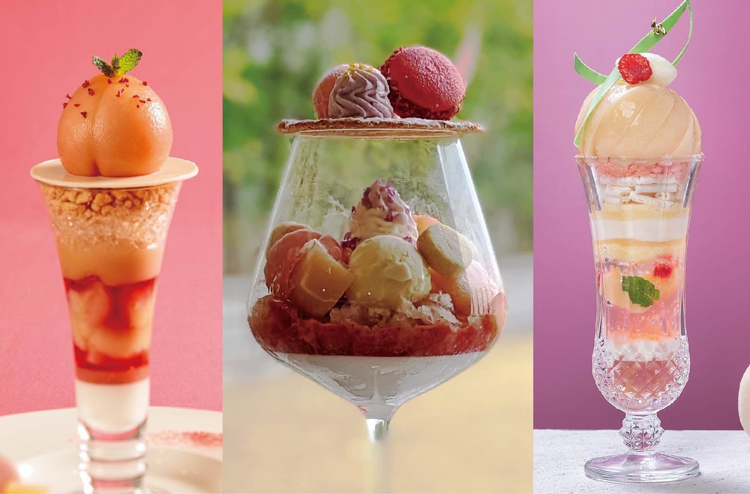 7月15日(金)から始まるフェア第一弾は、丸ごと1個の白桃を、そして、8月15日(月)からのフェア第二弾では、ピオーネやシャインマスカットなど大粒のぶどうを用いたパフェを企画しております。