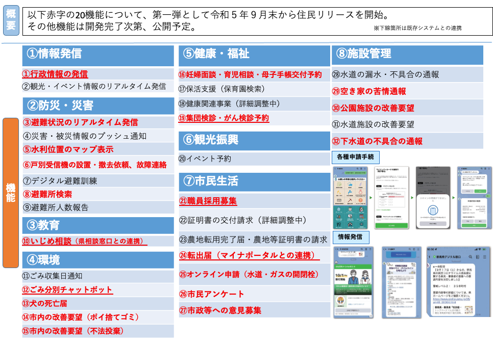スマホ市役所は24時間365日開設されており、市民は好きな時に好きな場所から、必要な情報の確認や各種行政手続きが可能となります。本日、避難所検索・ポイ捨てごみや不法投棄の通報・ごみ分別チャットボット、妊婦面談やがん検診予約など20機能を公開し、今後も機能を拡充予定です。(マイナンバーカードを活用した証明書請求は年度内に実装予定)