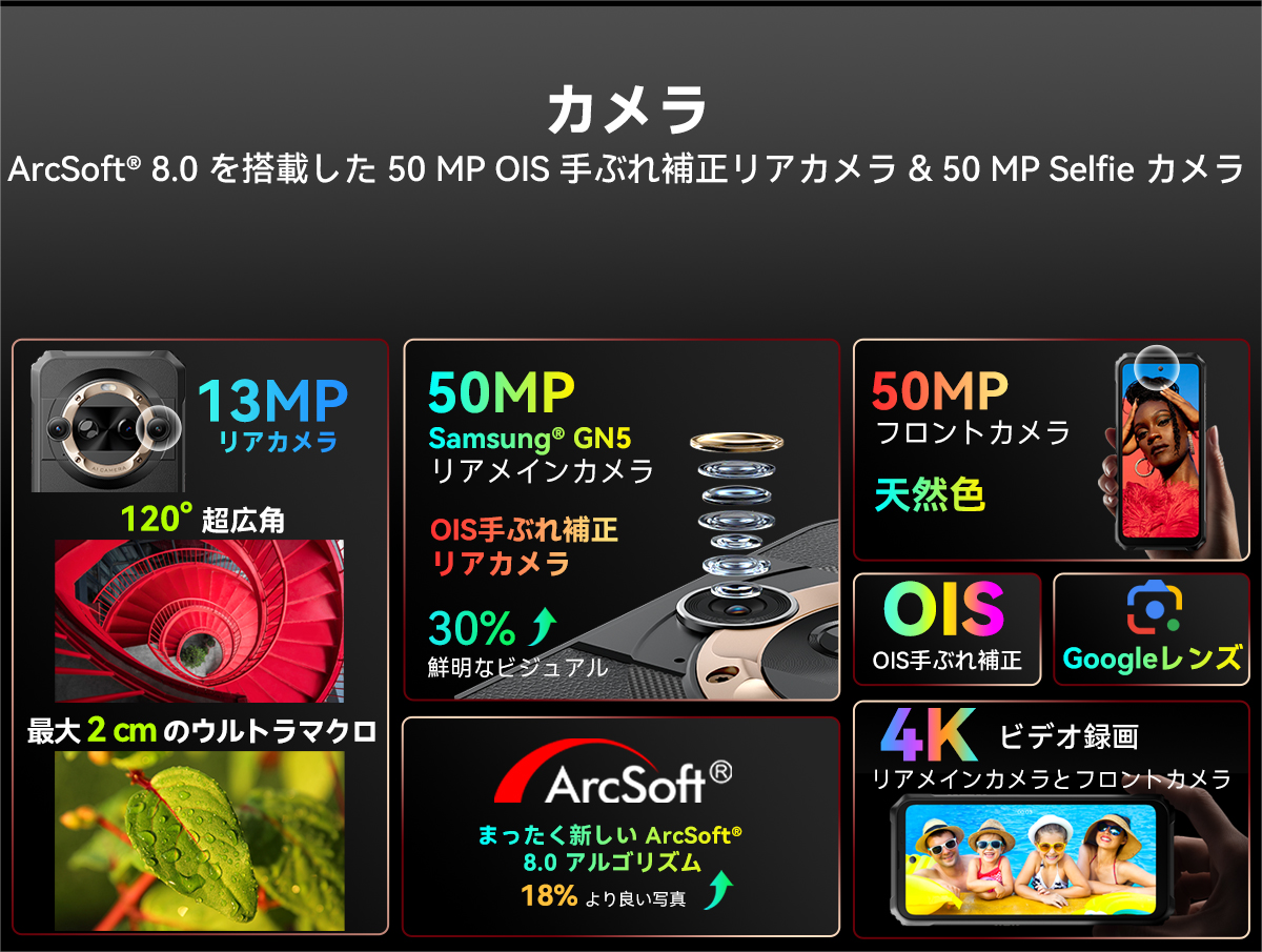 また、TÜV SÜDの低ブルーライト認証を取得しており、ユーザーの目の健康を保護してくれます。カメラに関しては、BL9000 Pro背面のメインカメラは50 MPのSamsung® ISOCELL GN5レンズを搭載し、フロントカメラには革新的な50 MPの高精彩セルフィーレンズを備えています。さらに13 MPの超広角および超マクロレンズも搭載されており、ArcSoft® 8.0アルゴリズムによって強化され、驚くほど明瞭かつ鮮やかな写真を撮影できます。さらに、4K超高解像度のビデオ録画も楽しめます。