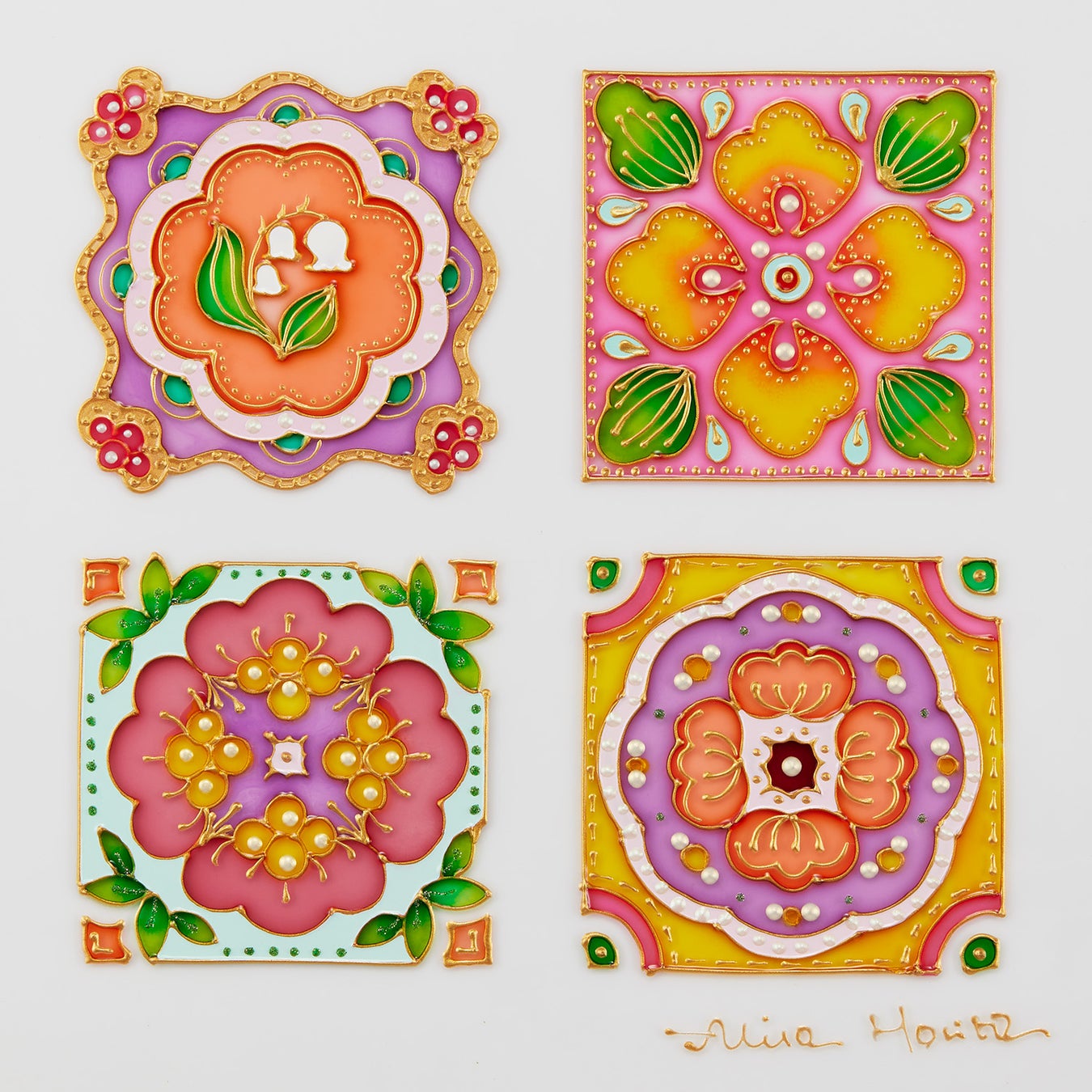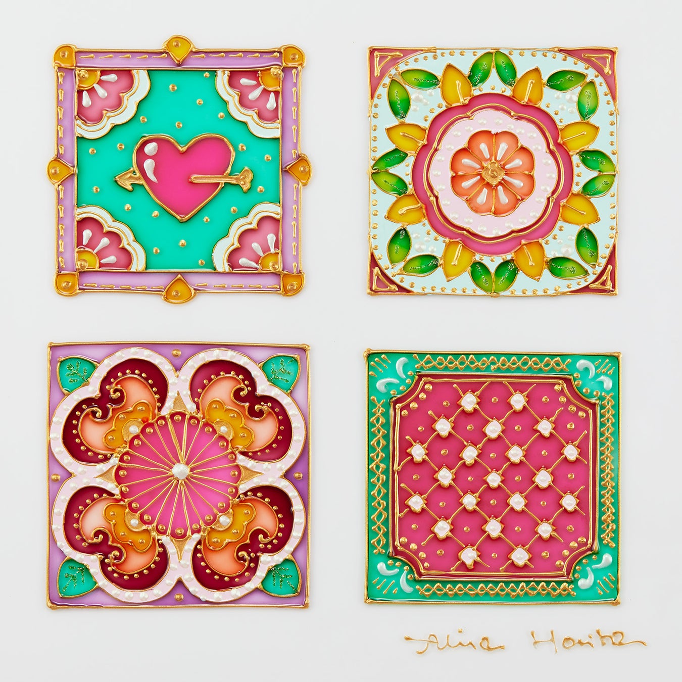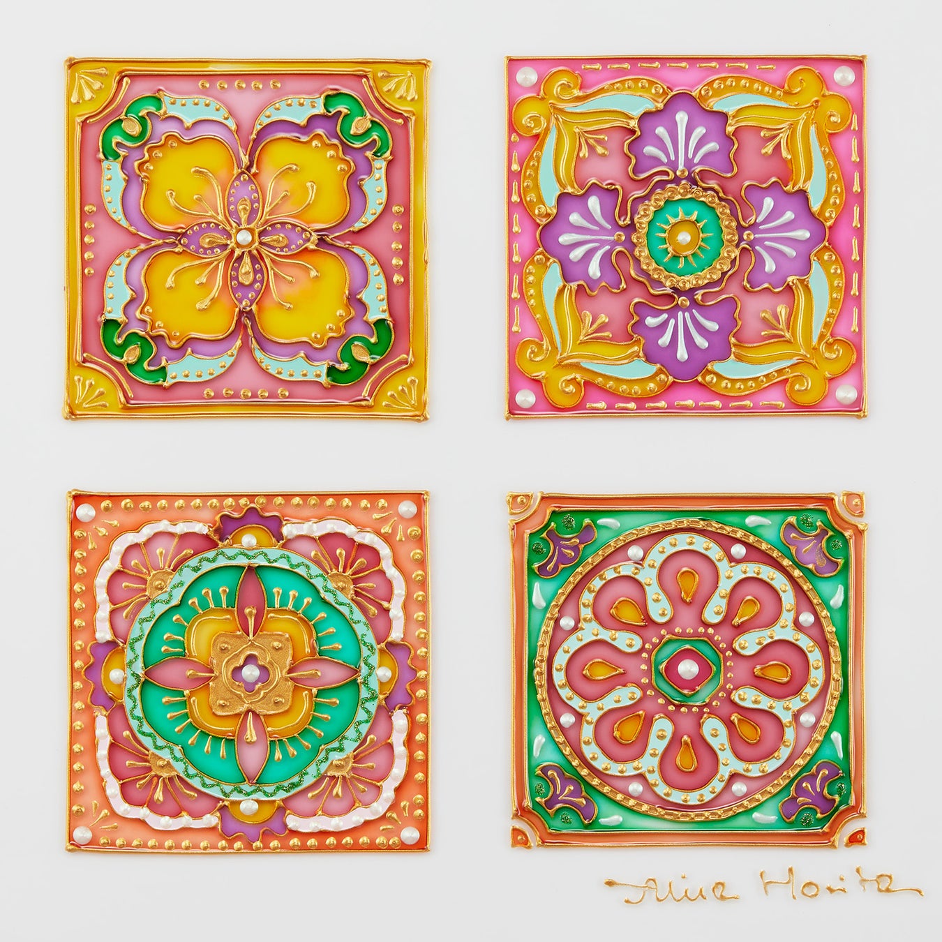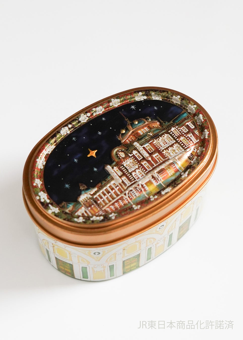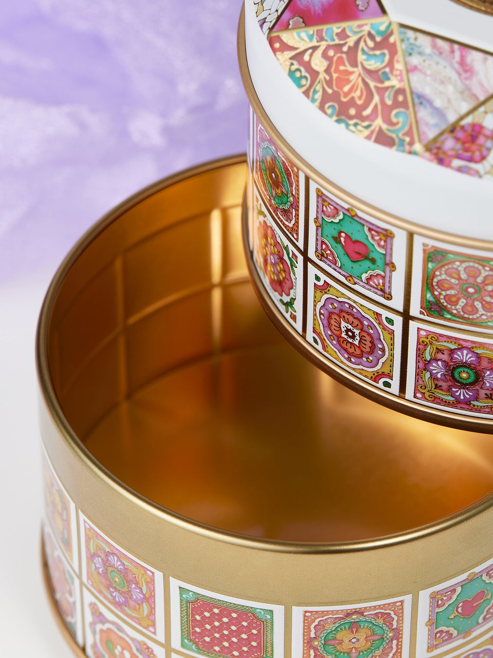 缶の側面には、レトロ可愛いミニチュアタイルをデザイン。タイルの部分は陶器のようなつるんとした質感です。ガラス絵の輝きをデザインに活かしました。