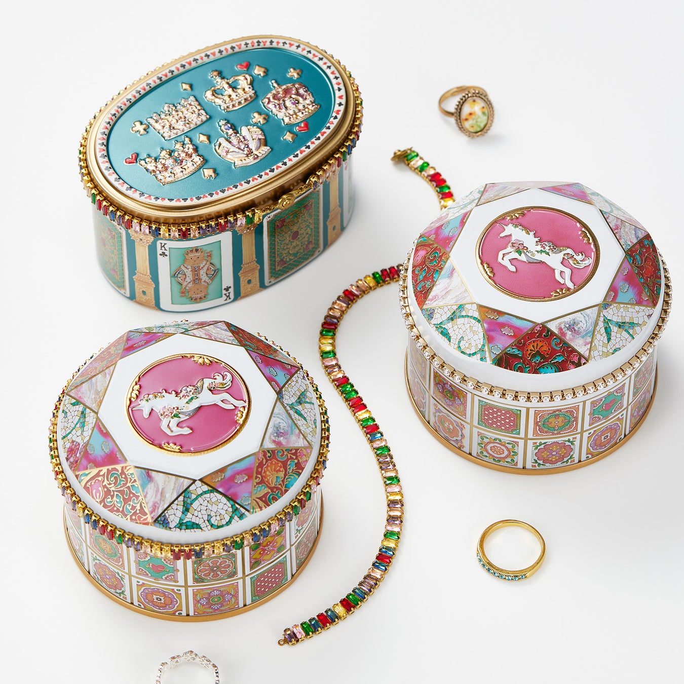 蓋のダイヤカット部分には、ユニコーンが飛んでいく虹色の空や、ユニコーンの蹄の音が響く夢のお城のタイルなどを配置。ユニコーンの世界観を表現したガラス絵を散りばめています。