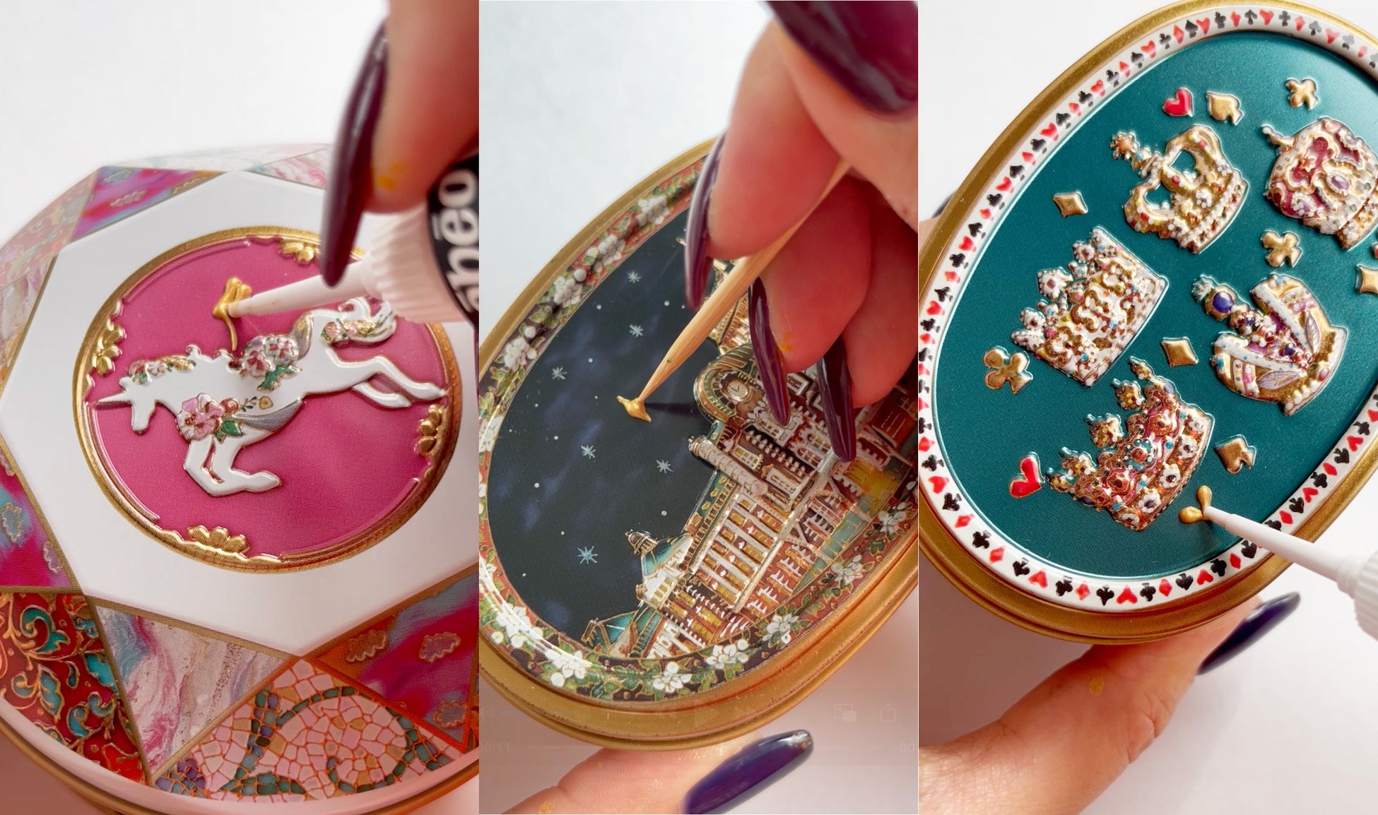 ユニコーン缶には『羽』のペイント、東京駅缶には『星』や『月』のペイント、ネコのトランプ缶2には『隠れハート』や『イニシャル』を描き込みます。