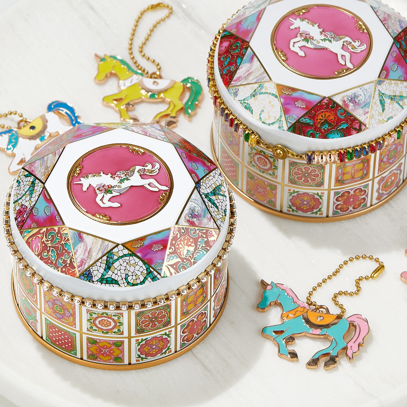 お菓子缶を開けると、ユニコーンチャームがメリーゴーランドのように登場します。