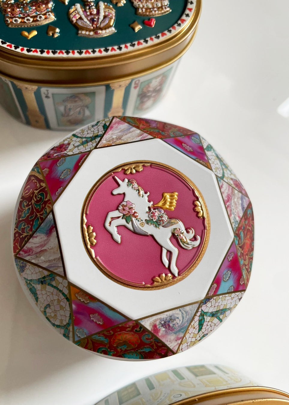 色とりどりの花をまとったドリーミールックなユニコーンは、今にも缶から飛び出して駆けていきそうです。