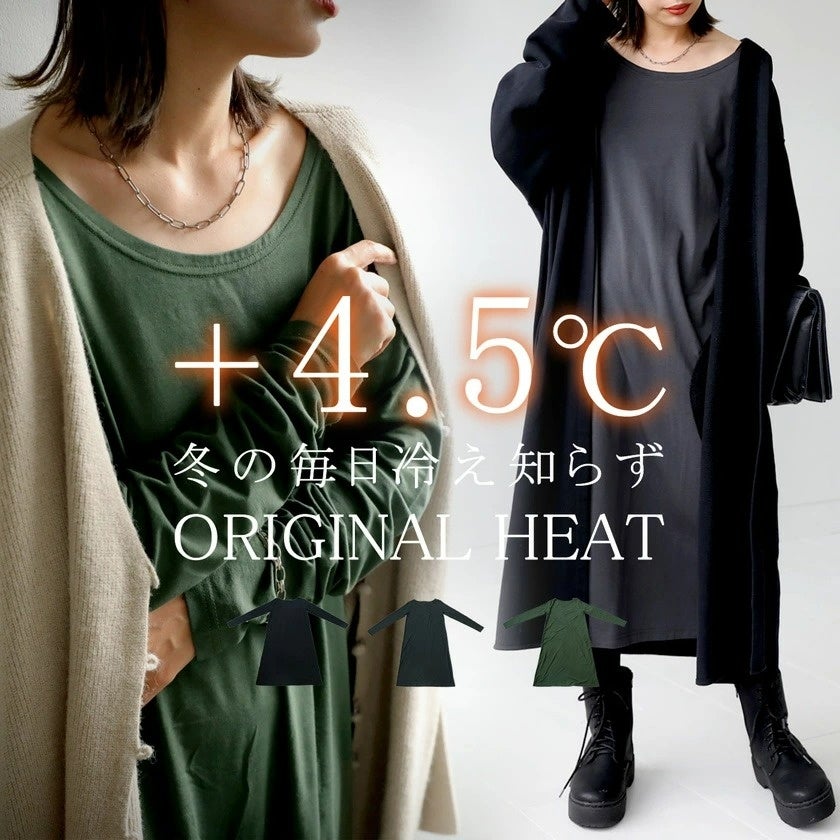 「オリジナルヒートワンピース」はシリーズ累計5万枚のヒット商品となっている、水分を吸収して熱エネルギーに変換する吸湿発熱素材から生まれた「ヒートロンT」に続くワンピース。着るだけでおよそ+4.5℃の体感温度が実感でき、これからの肌寒い季節に体の冷えが気になる方におすすめのワンピースです。