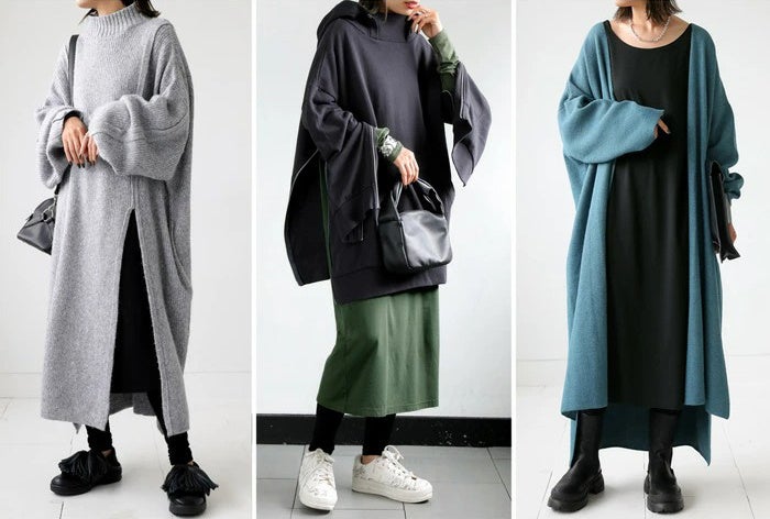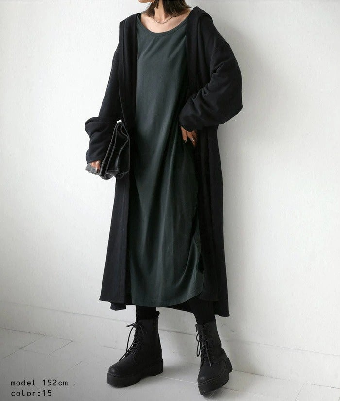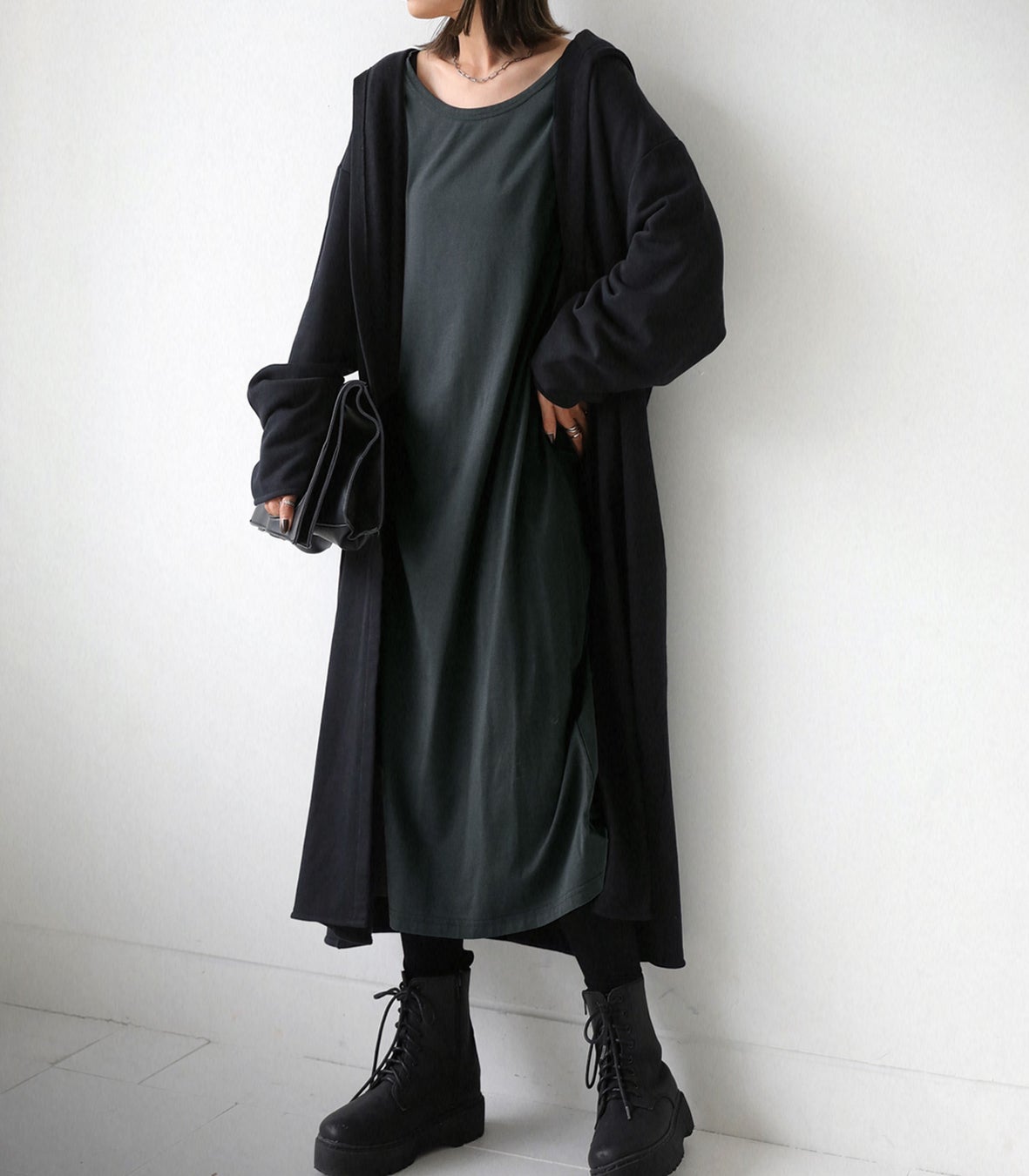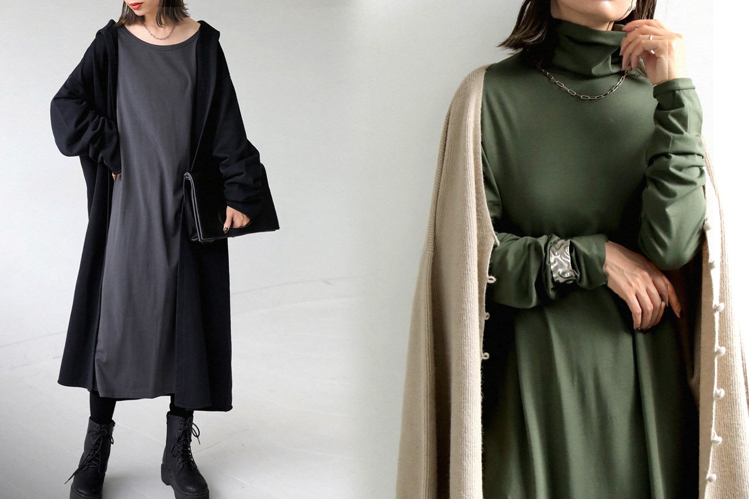 サイズはフリーサイズ。美しいシルエットにこだわったワンピースは一枚で着るのはもちろん、ゆったりとしたラフなサイズ感と、重ねることでおしゃれに見えるように計算されたちょうどよい丈感で、レイヤードするだけでオシャレ上級者に。