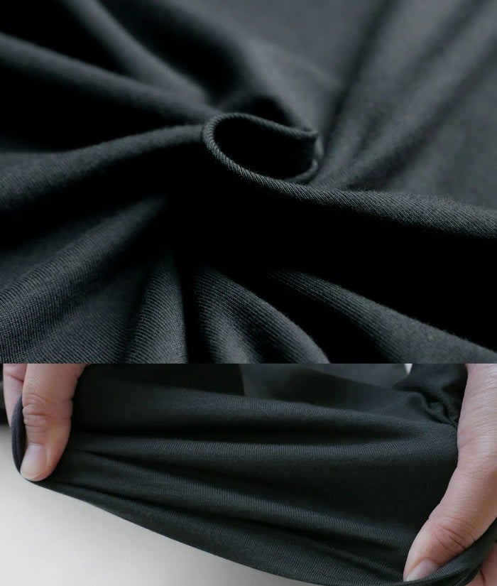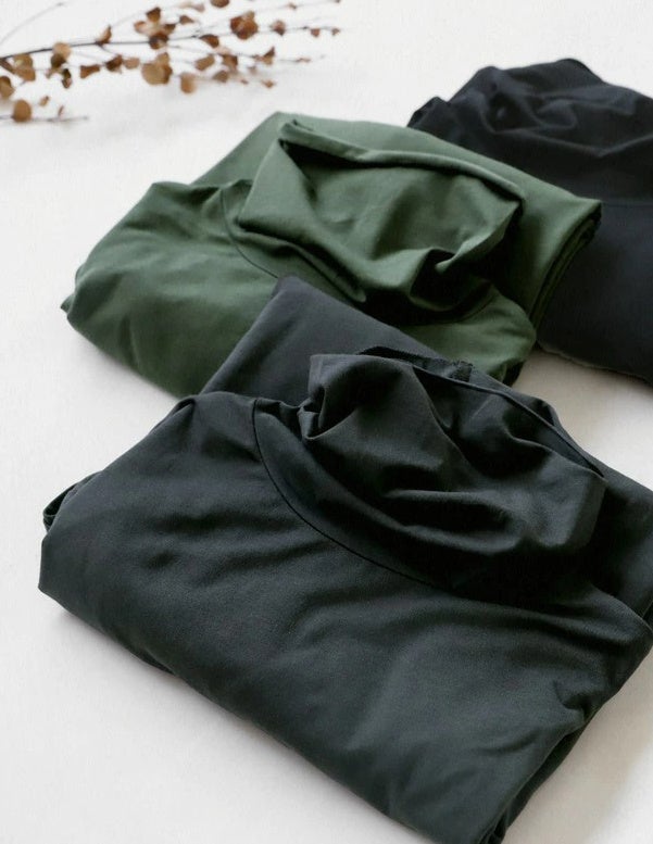 素材は天然素材のパルプを原料としたモダール素材。環境に優しい製造工程で生産され、高級感たっぷりでシルクのようななめらかな肌触りで肌にも優しいのが特徴です。薄くて軽いため、重ね着をしてももたつかないのも嬉しいポイント。カラーはブラック・カーキ・グレーの3色から選べます。