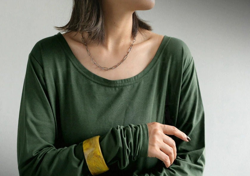鎖骨に沿って緩やかなカーブを描くクルーネックは、詰まりすぎず絶妙な開き具合でデコルテを美しく魅せてくれます。
