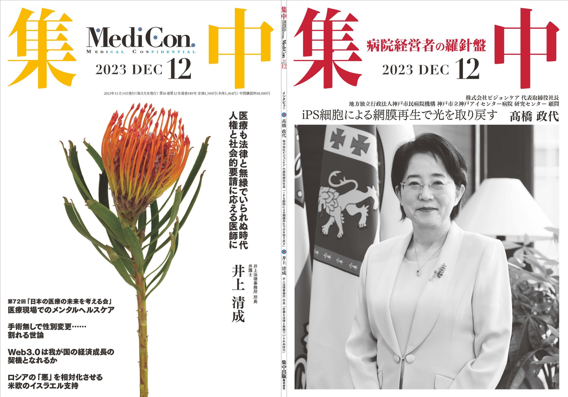 医療情報誌 月刊『集中』2023年12月号 巻頭インタビュー 髙橋政代・株式会社ビジョンケア代表取締役/集中OPINION 井上清成・井上法律事務所所長 他
