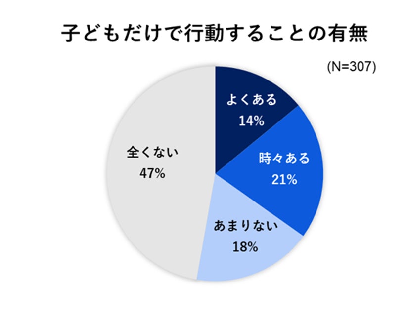 ・子どもだけで行動することがあるかの質問に対し、「よくある」が14%、「時々ある」が21%で、35%の家庭で子どもが1人で行動することがあると回答しました。