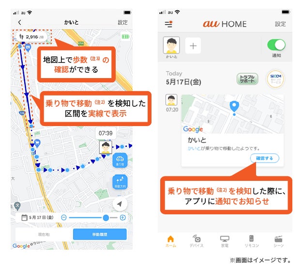 電車やバスなどの乗り物(注2)に乗っていることを検知した時に、アプリに通知が届き、移動履歴から確認できるようになります。