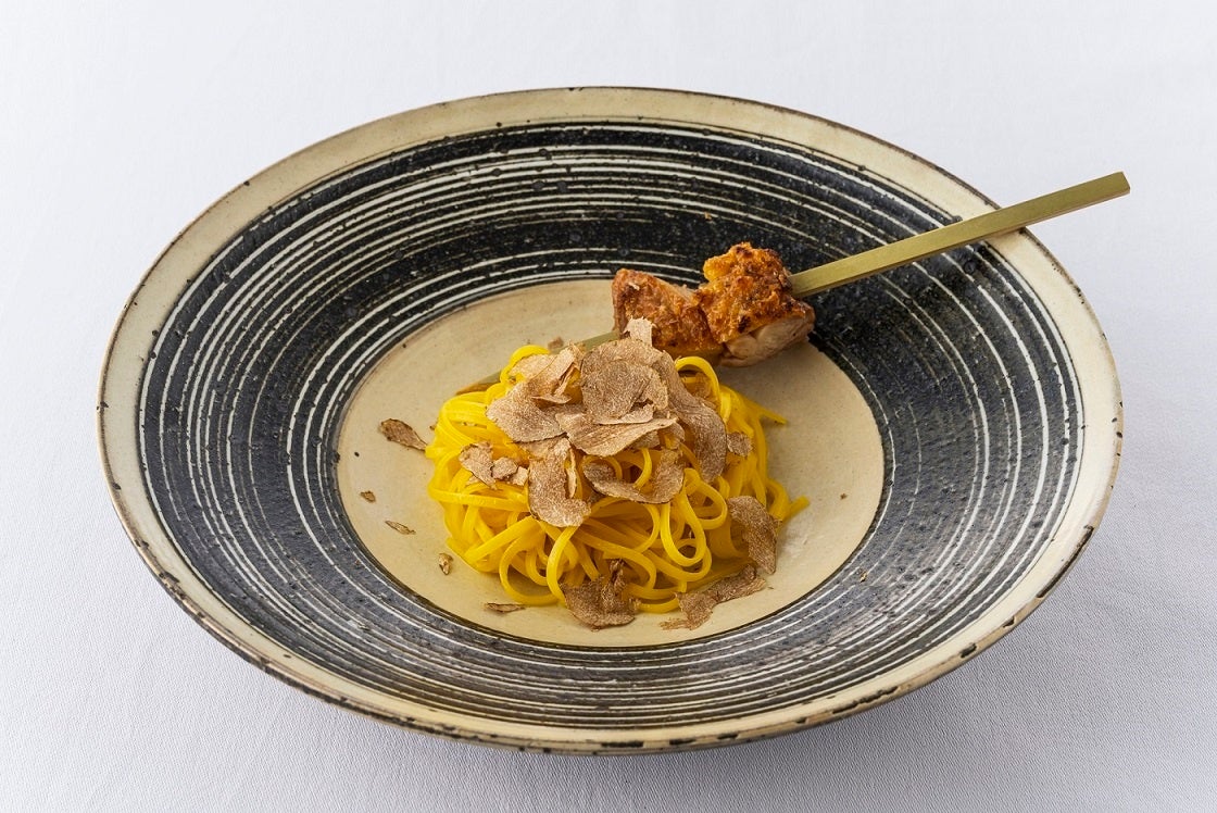 福岡県朝倉市にある天野商店の古処鶏(こしょどり)を添えた白トリュフのタヤリン(パスタ)。お客様の目の前で白トリュフをスライスし、白トリュフの芳醇な香りに包まれながら、お召し上がりいただきました。古処鶏を丸ごと一羽使ってとった、贅沢なだし汁のみでタヤリンを絡めています。古処鶏は地鶏の中でも旨みが強く、それでいて白トリュフの個性的な香りを邪魔せず、絶妙なマッチングを奏でます。