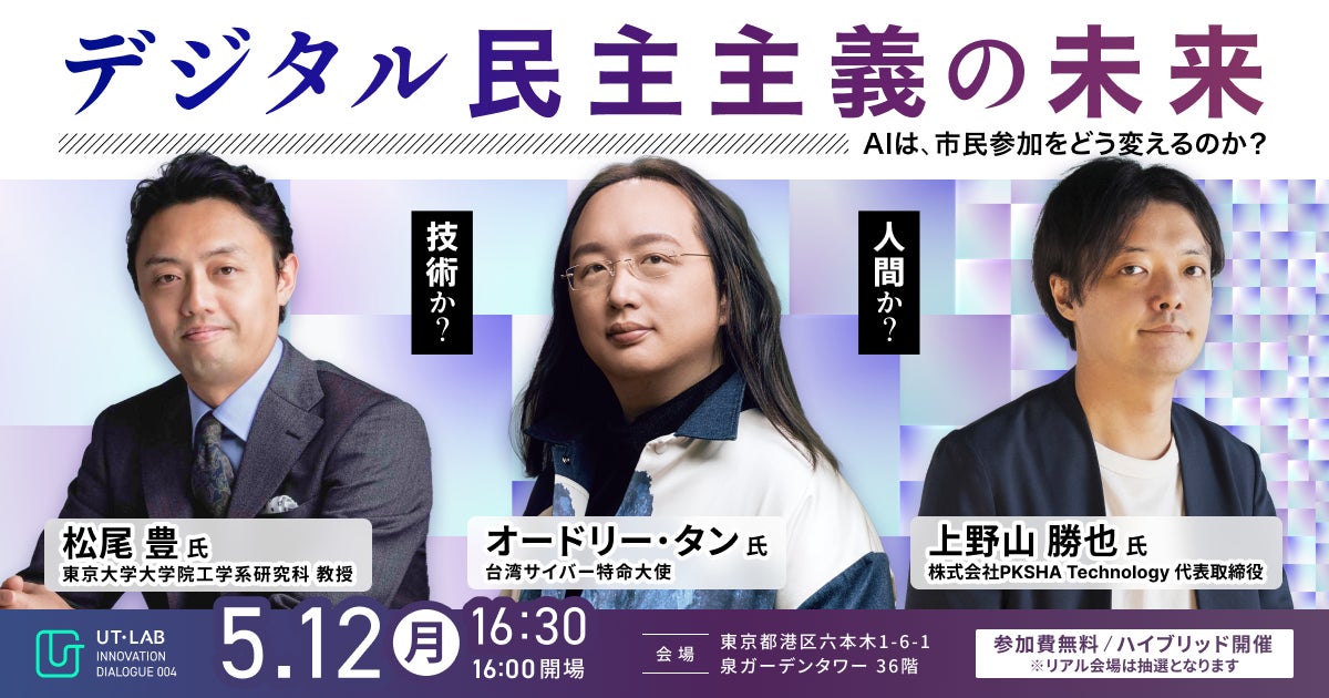 トグルホールディングス株式会社(本社:東京都港区、代表取締役:伊藤嘉盛、「当社」)が運営するイノベーションコミュニティ「UT-LAB」は、2025年5月12日(月)にAIに携わる著名人ををゲストに招き、イベント「デジタル民主主義の未来」を開催いたします。本イベントは、UT-LAB主催「Innovation Dialogue」シリーズの第4回となります。