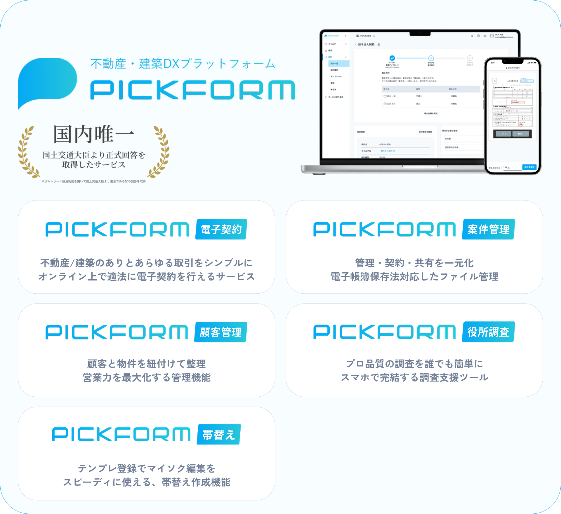 株式会社PICKは、「不動産取引を快適に、オープンに」をミッションに掲げる会社です。不動産・建築業界のバリューチェーンが抱える構造的な課題に対し、2022年の「PICKFORM 電子契約」をリリース以来、不動産/建築の取引における「顧客体験の向上」を目指している企業です。「PICKFORM 電子契約」では国内で唯一国土交通大臣より正式回答をもらい、新しい法律に対しても安心して”適法に”利用していただけるサービスとして、導入企業が増えております。 今後は、不動産/建築業者の皆様の業務を1つでも多く解決するべく、業者様の業務のあらゆるシーンにおけるサービスリリースを予定しています。PICKFORMは不動産・建築特化の Verticalオールインワン SaaSとして業界に貢献できるよう進化します。