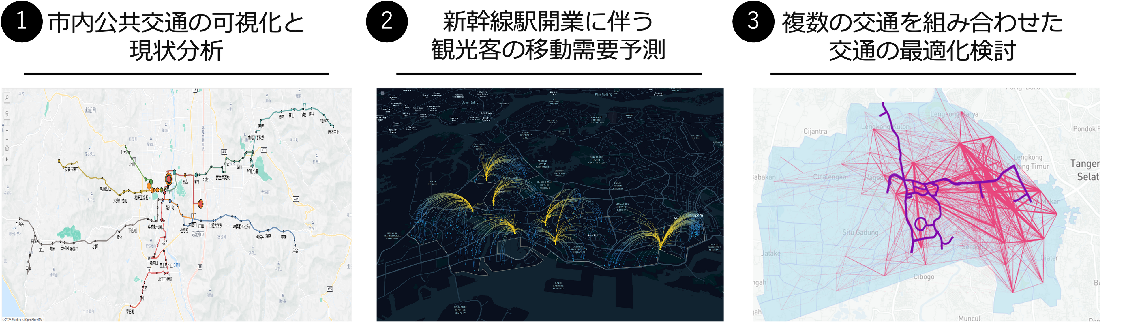 路線バス、市民バス、定額タクシー、実証実験中のデマンド交通の乗降データや人口密度など統計情報を活用し、既存の公共交通を可視化・分析します。新幹線駅開業に伴う観光客の移動需要予測